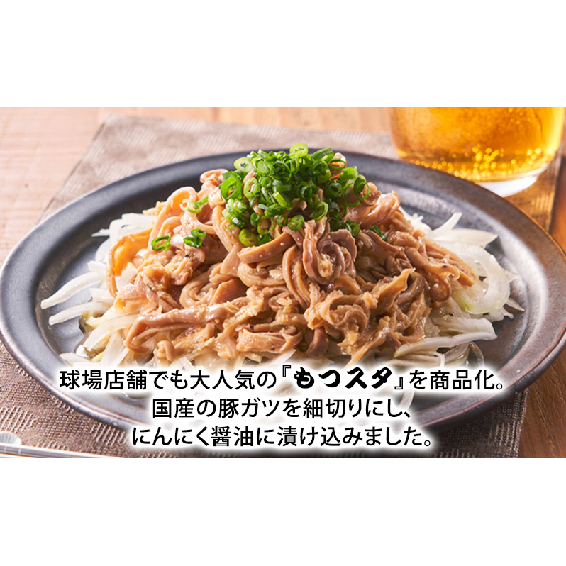 球場店舗でも大人気の『もつスタ』を商品化。国産の豚ガツを細切りにし、にんにく醤油に漬け込みました。