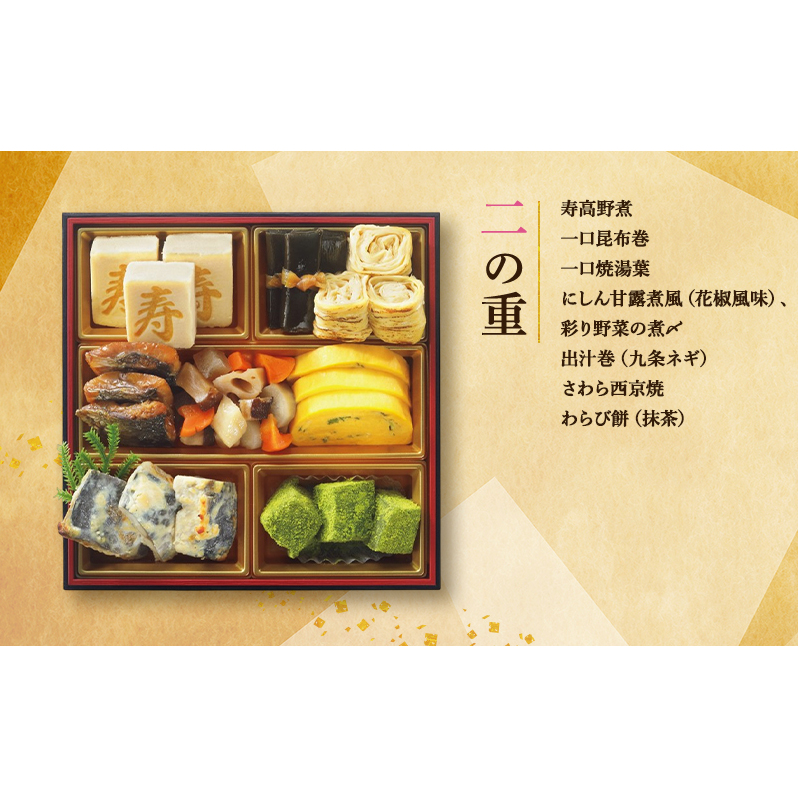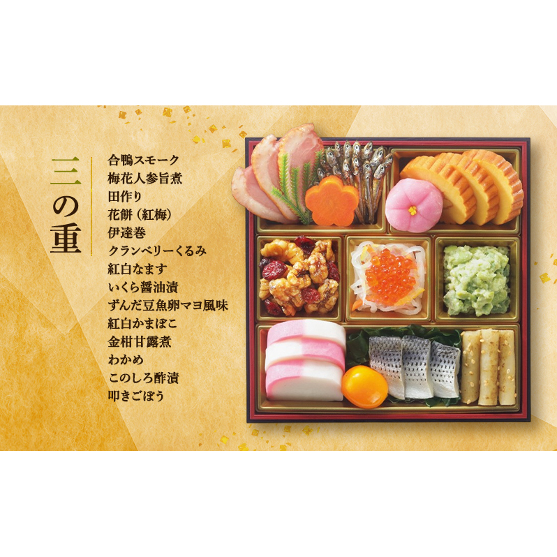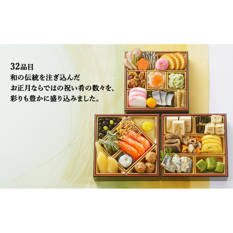 32品目<一の重>黒豆煮、うぐいす豆、紅はるかきんとん、栗甘露煮、笹巻団子、牛肉と筍のしぐれ煮、味付数の子、花餅(白梅)、祝い海老、純輝鶏の肉団子<二の重>寿高野煮、一口昆布巻、一口焼湯葉、にしん甘露煮風(花椒風味)、彩り野菜の煮〆、出汁巻(九条ネギ)、さわら西京焼、わらび餅(抹茶)<三の重>合鴨スモーク、梅花人参旨煮、田作り、花餅(紅梅)、伊達巻、クランベリーくるみ、紅白なます、いくら醤油漬、ずんだ豆魚卵マヨ風味、紅白かまぼこ、金柑甘露煮、わかめ、このしろ酢漬、叩きごぼう