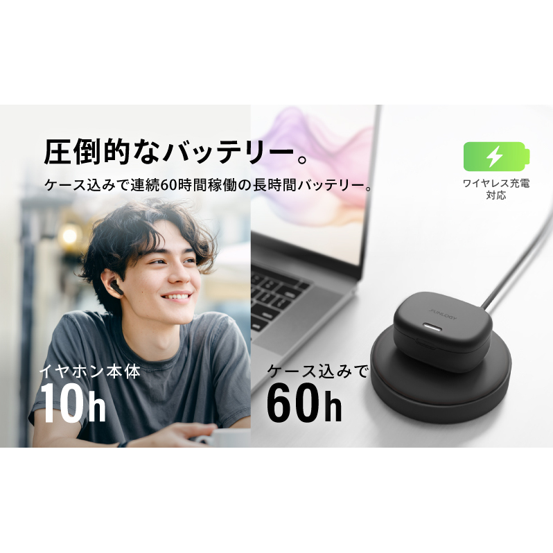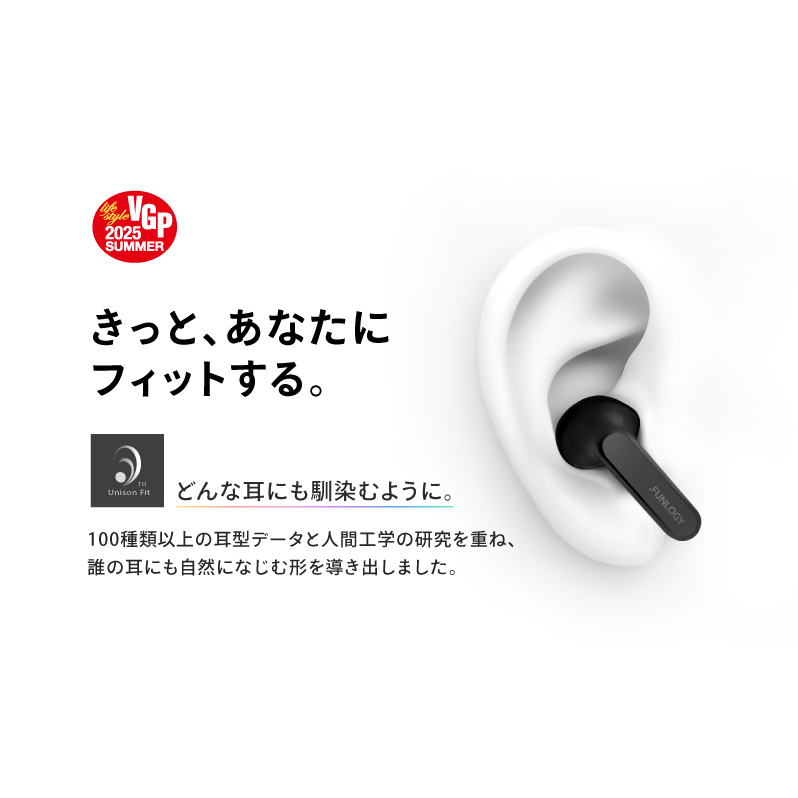 FUNLOGY Pure Sound Engineが、クリアな高音、厚みある中音、締まった低音をバランスよく再生。3Dフィット設計で長時間でも快適に装着でき、映画館やライブ会場にいるような没入体験を実現。