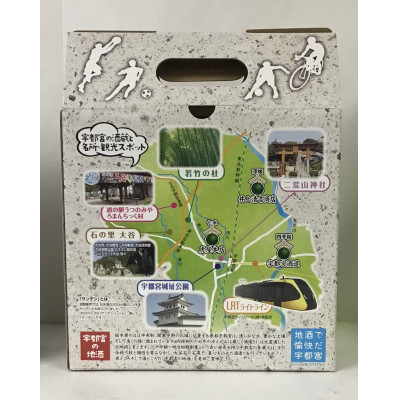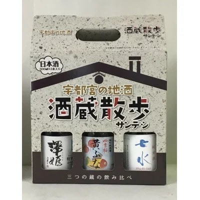 宇都宮市の3つの酒蔵の純米酒が飲み比べできる「酒蔵散歩」です。宇都宮市の伝統的な石材【大谷石】をイメージしたパッケージに、300mlの純米酒が各蔵元別に3種類入っています。