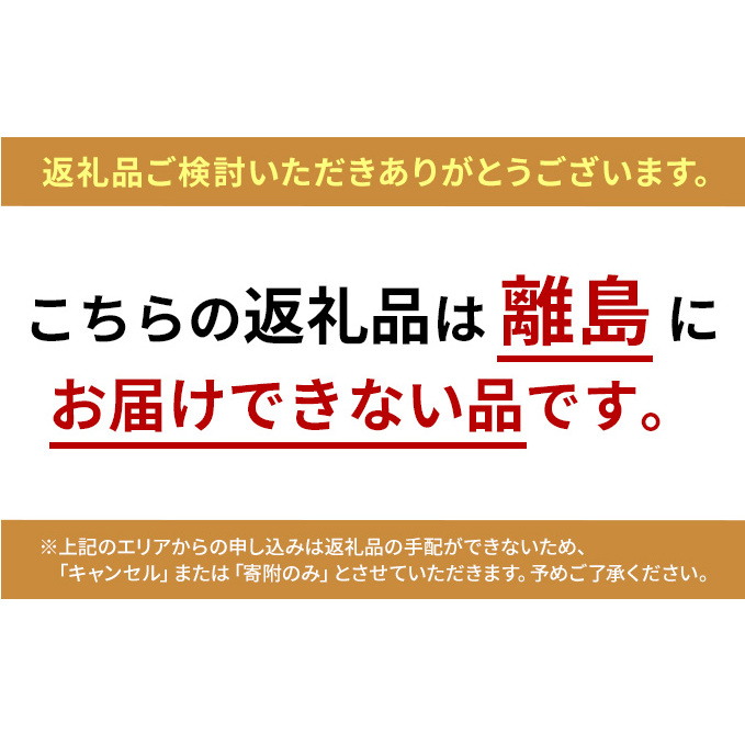 ※上記のエリアからの申し込みは返礼品の手配が出来ないため、「キャンセル」または「寄附のみ」とさせていただきます。予めご了承ください。