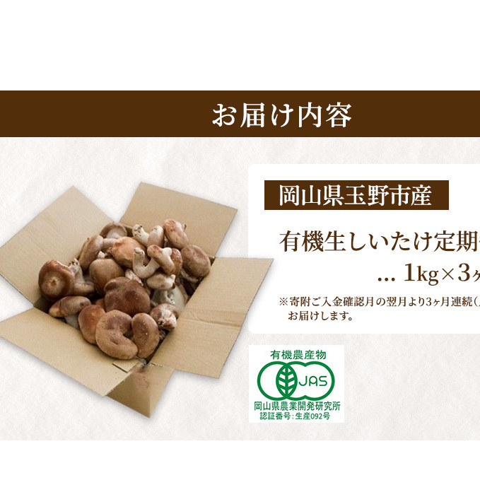 【 産地直送 】 有機JAS 生しいたけ 定期便 1kg×3ヶ月 オーガニック しいたけ きのこ 野菜 岡山県 玉野市 栽培期間中化学肥料不使用 栽培期間中農薬不使用 野菜セット