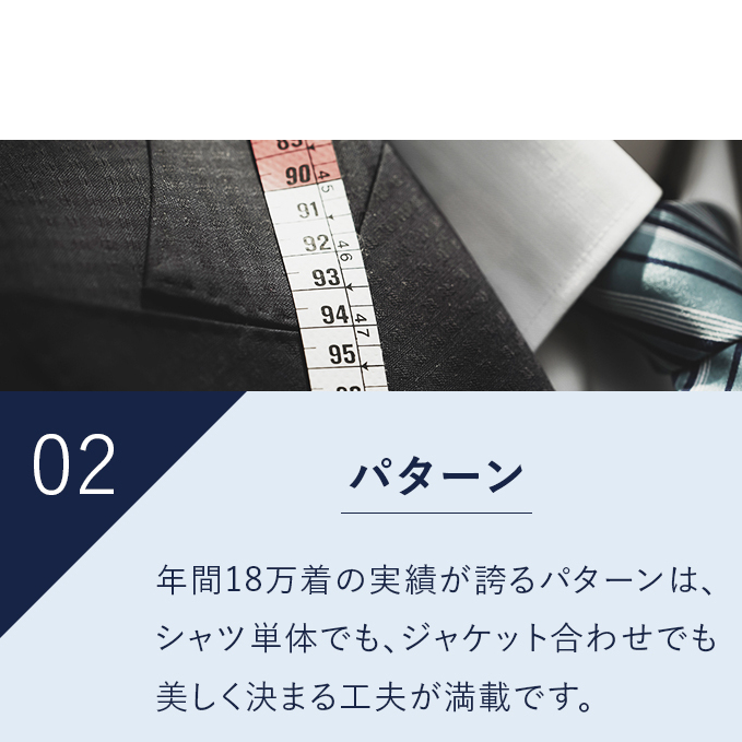 【Darts Model】後ろ身頃に2本のダーツを入れ、バストとウエストのドロップ差を多くとった、現代的なスリムフィットモデル。