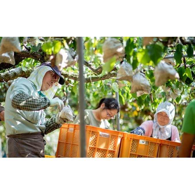 10月中旬に収穫しまして、発送が始まる11月下旬まで冷蔵庫で保存し、ワインのように追熟させて香りと味を高めます。
