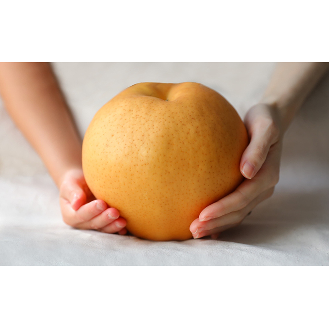 この大きさからは想像も出来ないほど繊細な味で、完熟してくると、しっとりした独特の食感と甘味が特徴の甘~いジャンボな梨です。