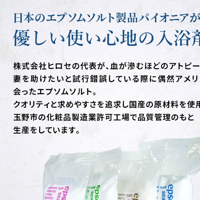 テレビや雑誌、芸能人やモデルにも紹介され注目を集めるエプソムソルト。エプソムソルトは塩ではなく硫酸マグネシウムの結晶です。エプソムソルトシークリスタルスは、化粧品製造許可を持つ工場で製造しています。品質にこだわり、毎日のバスタイムに心地よくお使いいただけます。塩分を含まないため、浴槽を傷めにくく、使用後のお湯は洗濯にも活用できます。健やかな暮らしをサポートするリラックスバスをお楽しみください。