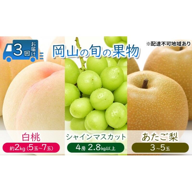 7. フルーツ 定期便 【2025年 先行予約】 桃 ぶどう 梨 3回お届け 白桃 約2kg入り(5玉~7玉) シャインマスカット 4房2.8kg以上 あたご梨 (3~5玉) 岡山県産 国産 セット ギフト