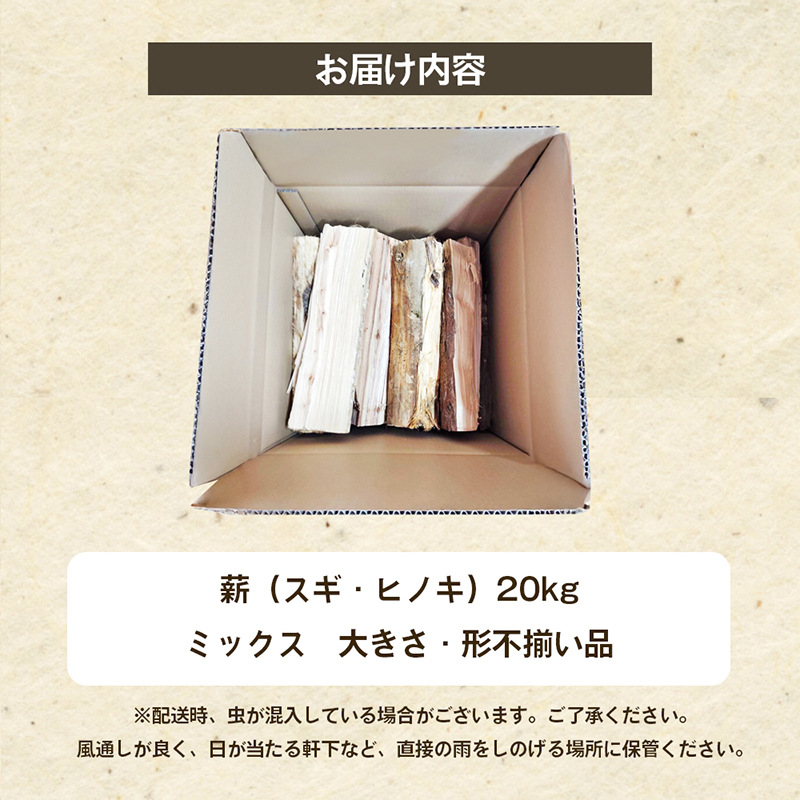 薪(スギ・ヒノキ ミックス 大きさ・形不揃い品)20kg アウトドア キャンプ 薪ストーブ 燃料 焚火 アウトドアグッズ キャンプ用品