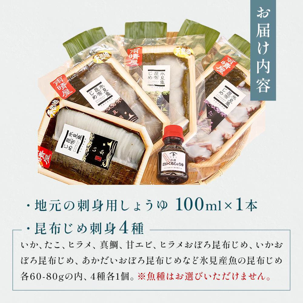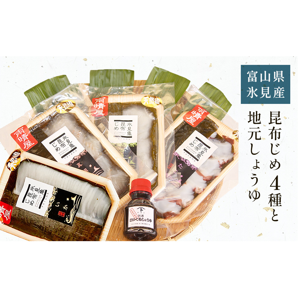 氷見 堀与 昆布じめ4種と地元しょうゆのセット 富山県 氷見市 昆布〆 食べ比べ 詰め合わせ しょうゆ 刺身