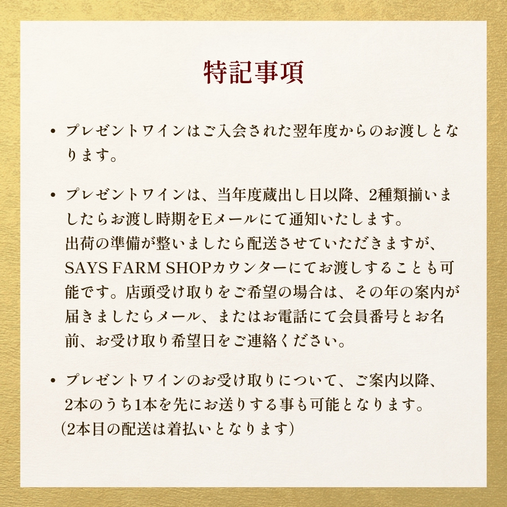 ※プレゼントワインは、当年度蔵出し日以降、2種類揃いましたらお渡し時期をEメールにて通知いたします。出荷の準備が整いましたら配送させていただきますが、SAYS FARM SHOPカウンターにてお渡しすることも可能です。店頭受け取りをご希望の場合は、その年の案内が届きましたらメール、またはお電話にて会員番号とお名前、お受け取り希望日をご連絡ください。