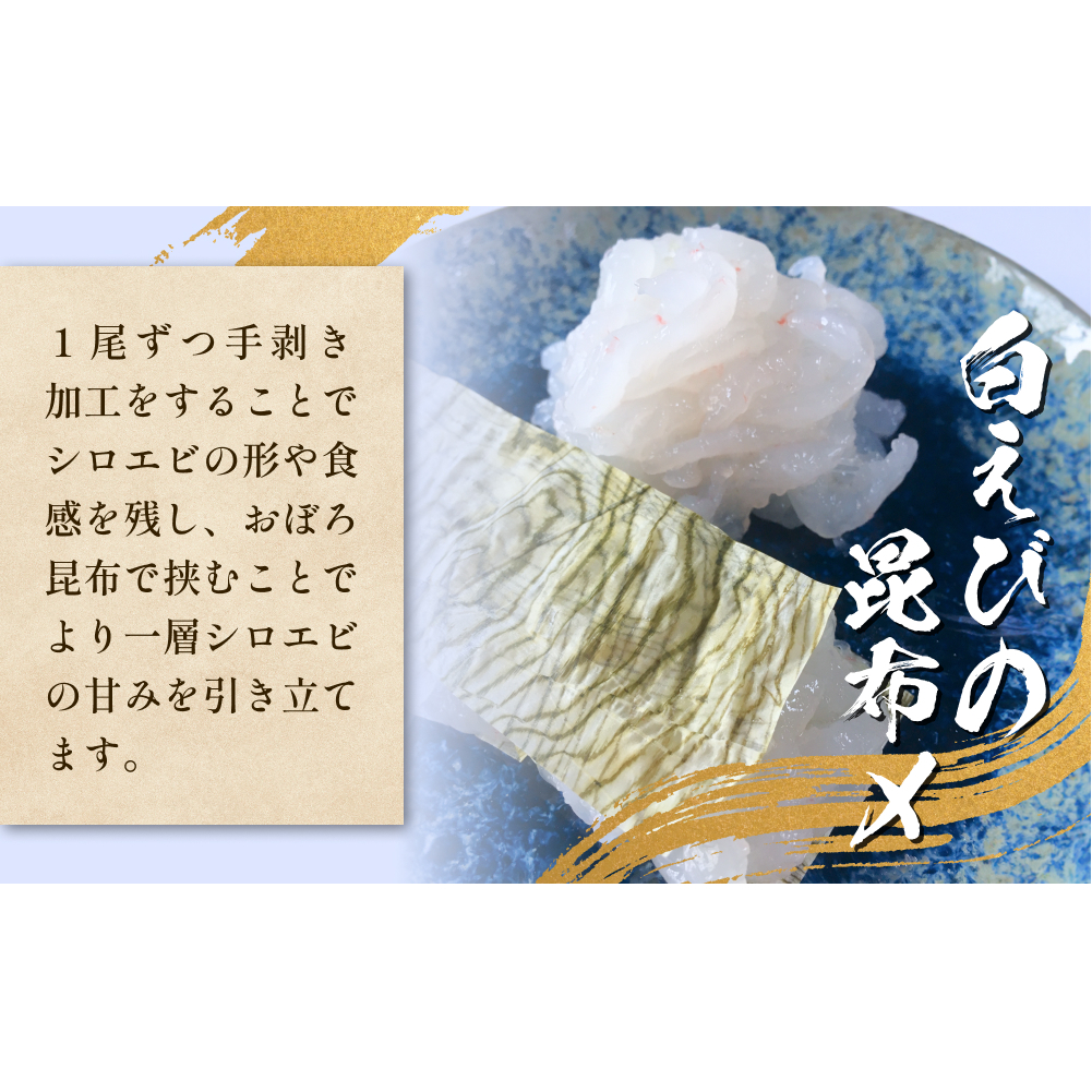 おぼろ昆布で挟むことでより一層シロエビの甘みを引き立てます。