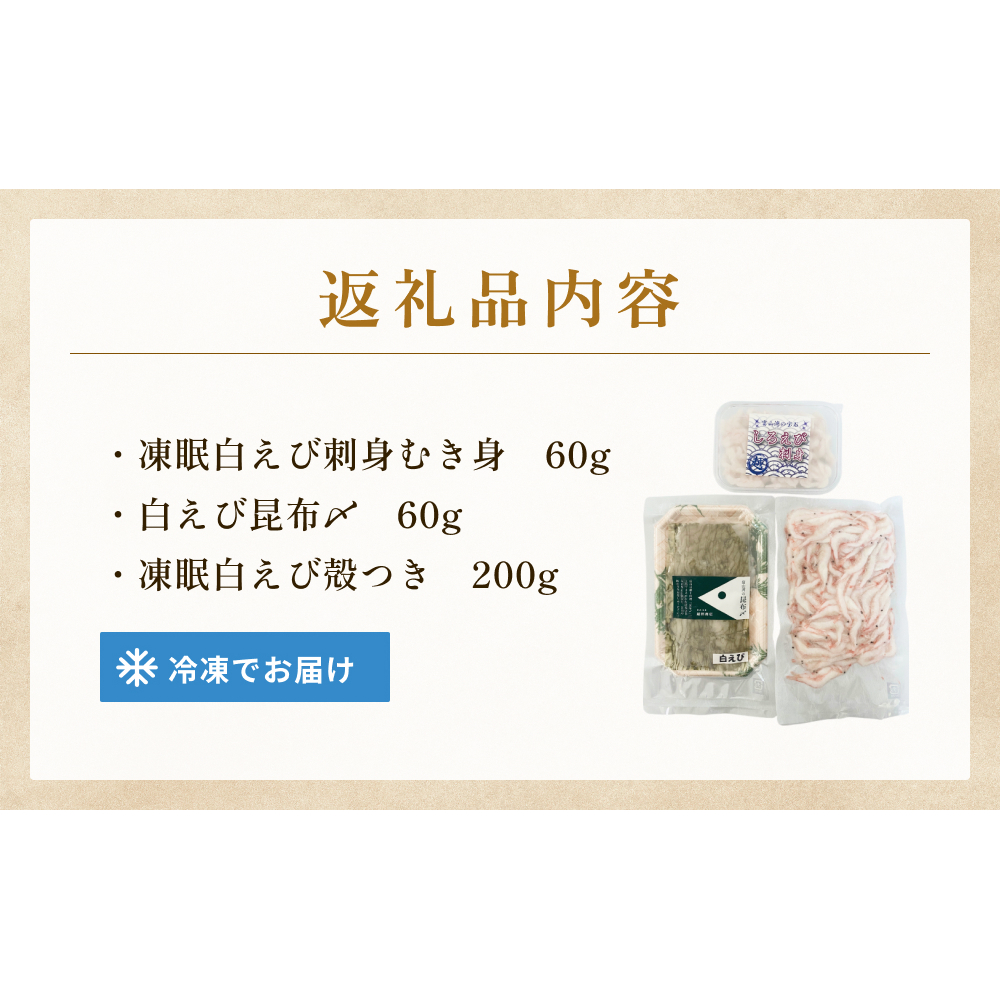 ・凍眠白えび殻つき (200g):白えび(富山湾産)、食塩