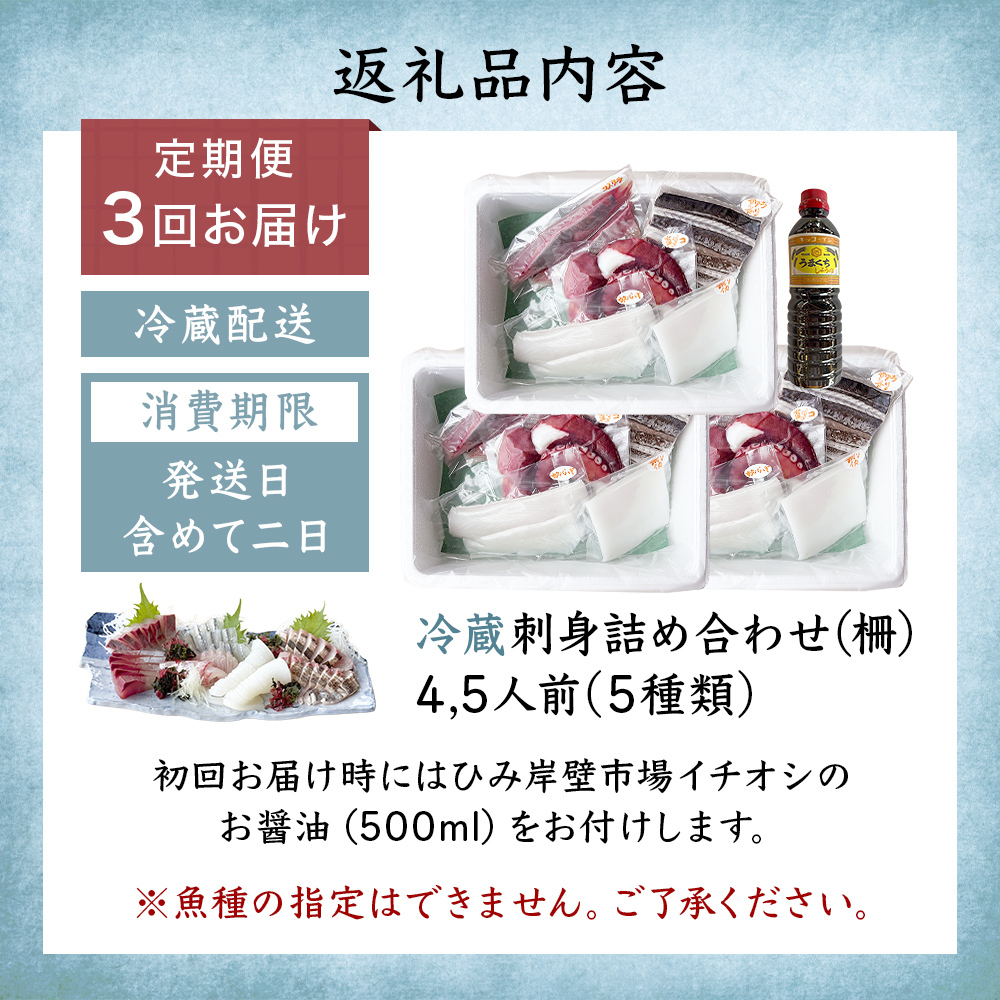 【3回定期便】 冷蔵刺身詰め合わせ(柵) 4,5人前 (5種類) 【初回醤油付】 釣屋魚問屋直営 ひみ岸壁市場
