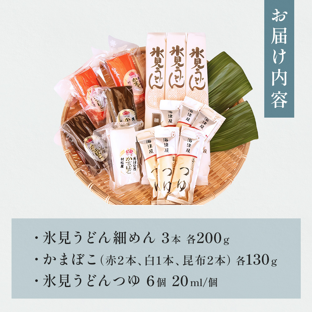 これに、うどんつゆと北陸独特の板のない巻かまぼこ(赤白昆布の3種)がつきます。
