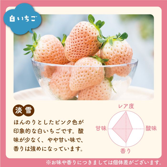名前の通り、「淡い雪」を連想するような甘くほのかに酸っぱいこのいちごをぜひご賞味ください。