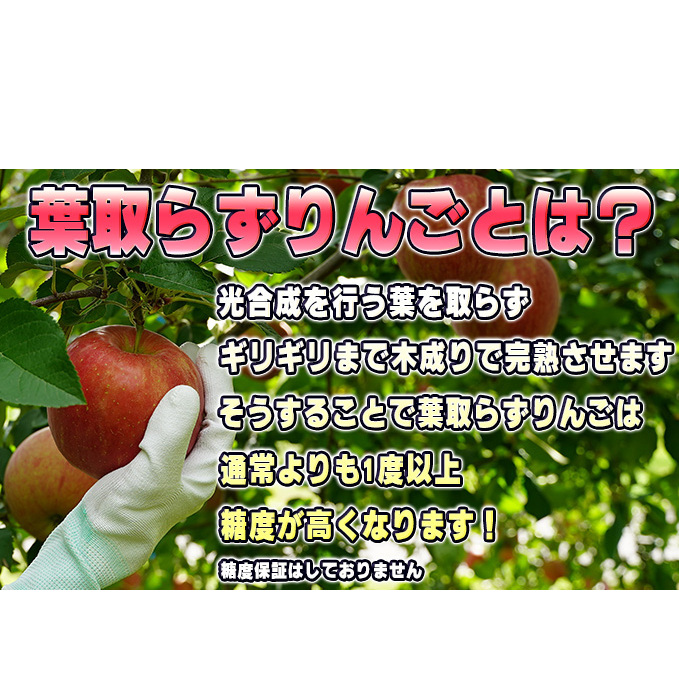 葉取らずりんごは、光合成を行う葉を取らずにそのままギリギリまで木成りで完熟させることで、通常よりも1度以上糖度が高くなります。葉を取らないことにより、果実の日光の当たり方にむらができやすく、その色廻りのためあまり市場に出回らない地産消費のまさに産地ならではの逸品です。