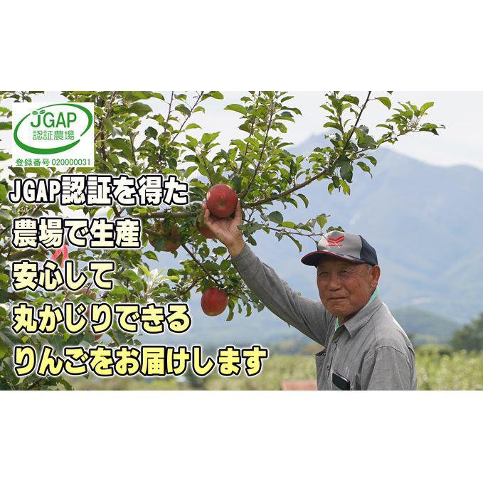 太陽の恵みをいっぱい浴びた葉取らずりんご、JGAP認証を得た農場で生産 した、安心して丸かじりできるりんごです。