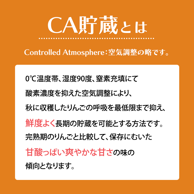 0℃温度帯、湿度90度、窒素充填にて酸素濃度を抑えた空気調整により、秋に収穫したりんごの呼吸を最低限まで抑え、鮮度よく長期の貯蔵を可能とする方法です。完熟期のりんごと比較して、保存にむいた甘酸っぱい爽やかな甘さの味の傾向となります。(特性上蜜入りはほぼございません。)