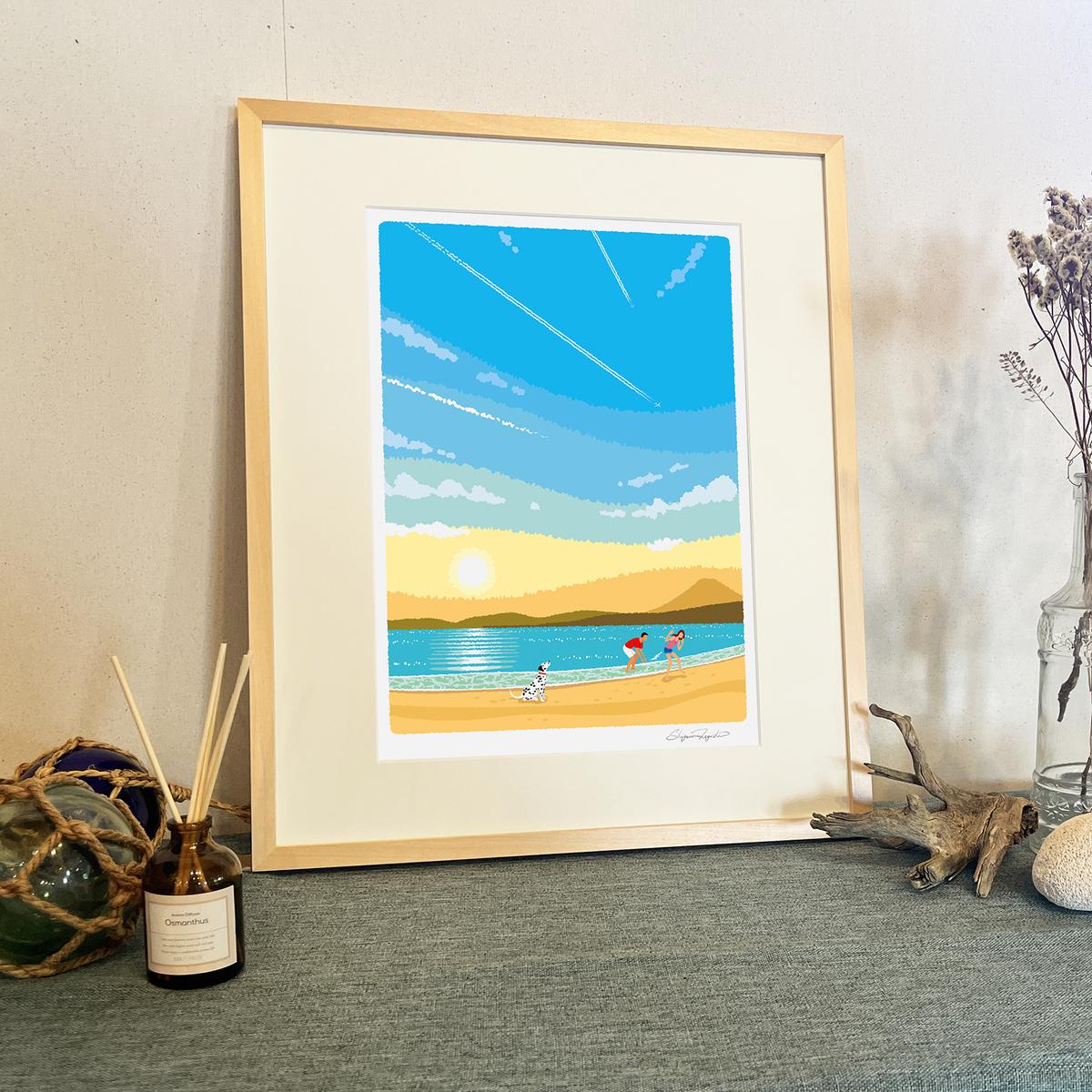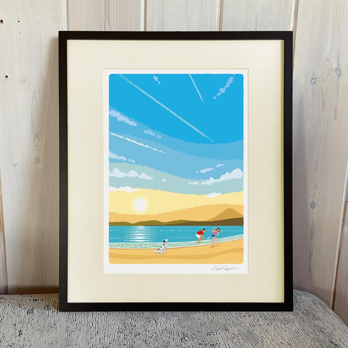 7. 湘南・茅ヶ崎で描く、海を感じるイラストアート 『 湘南ランドスケープ02:ひこうき雲 』 ジークレーアートフレーム (大) /絵画 風景 版画
