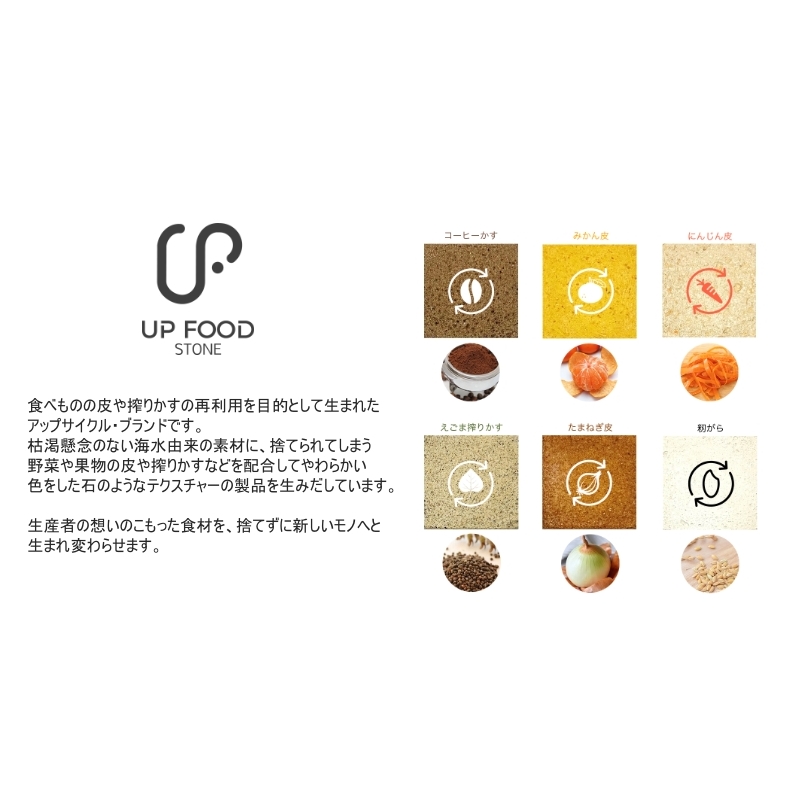 海水由来の自然素材に野菜・果物・穀物などの皮や殻、搾りかすなどの残渣を20%ほど配合して、食べモノのやわらかい色と風合いをもった石のような素材を生みだすプロダクトブランドです。石油由来の化学物質は不使用で、成型には熱を使用しないことで環境負荷を抑えています。