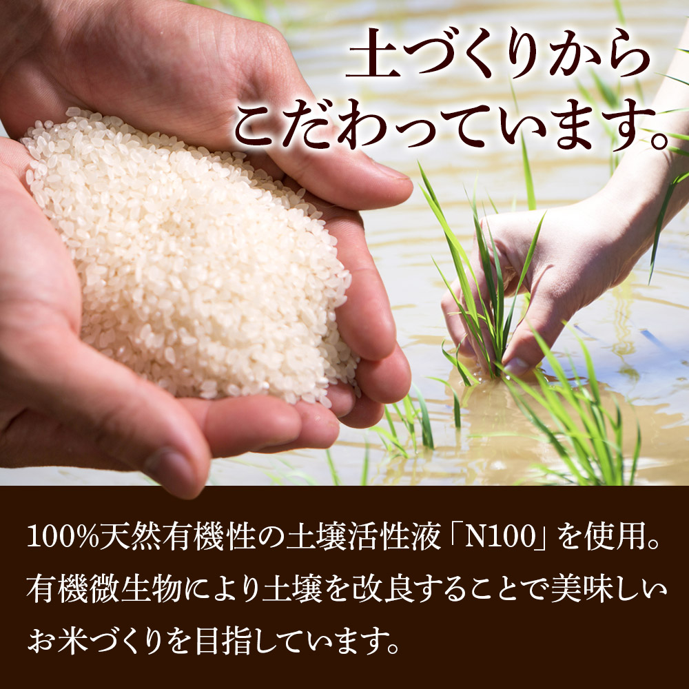 100%天然有機性の土壌活性液「N100」を使用し、有機微生物により土壌を改良することで美味しいお米づくりを目指しています。