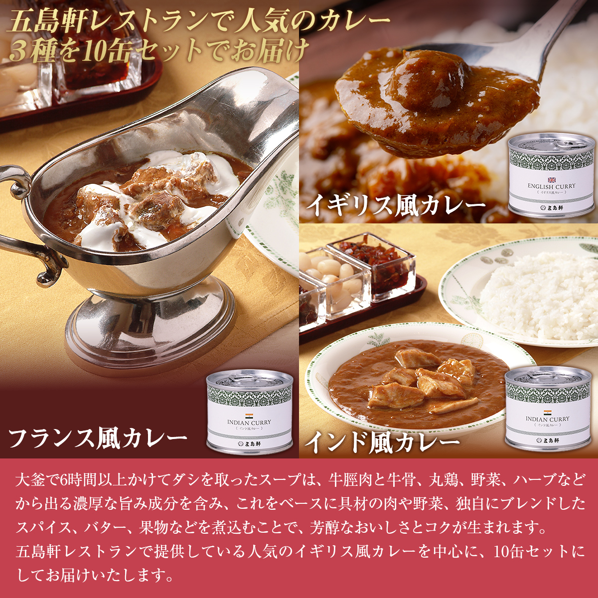 五島軒レストランで提供している人気のイギリス風カレーを中心に、10缶セットにしてお届けいたします。