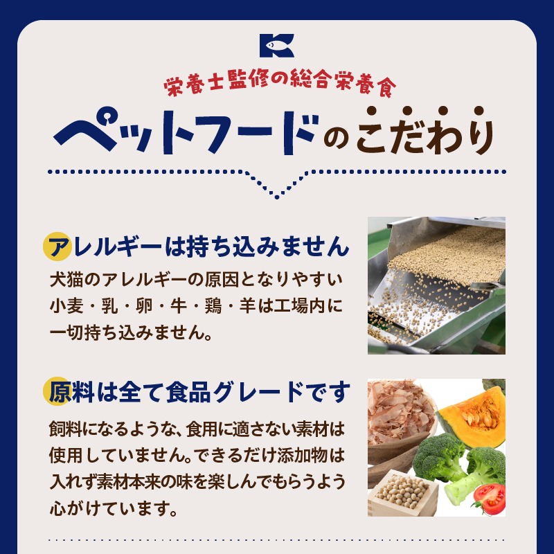 【説明】新鮮な生の カツオ マグロ を使用。鰹節の香りがしっかり薫り、食物アレルギーに配慮した、グレインフリー、酸化防止剤・着色料不使用のドライフードです。