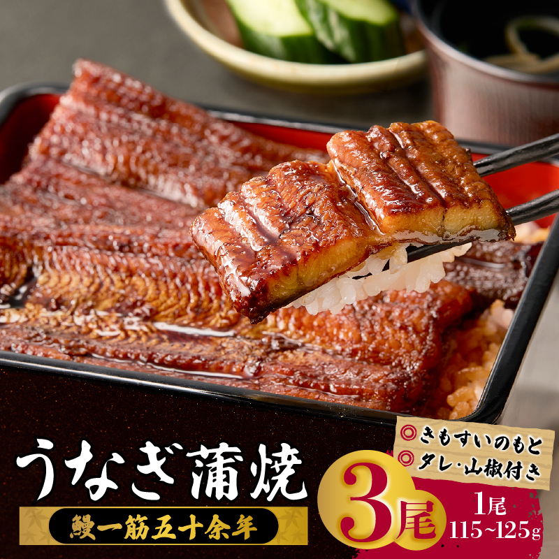 【内容】鰻蒲焼真空パック〈3人前〉(1人前 115g~125g)山椒、タレ付、きもすいのもと(粉末スープ):3袋