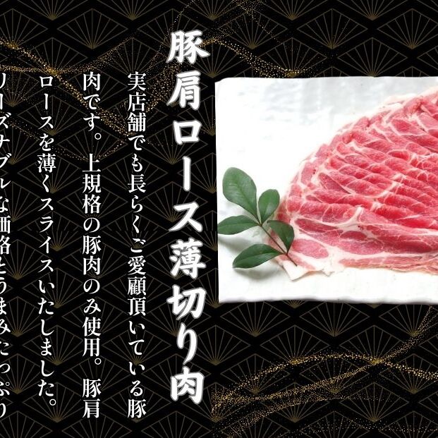 実店舗でも長らくご愛顧頂いている豚肉です。上規格の豚肉のみ使用。豚肩ロースを薄くスライスいたしました。