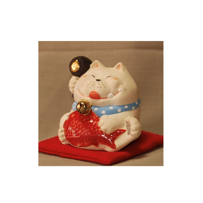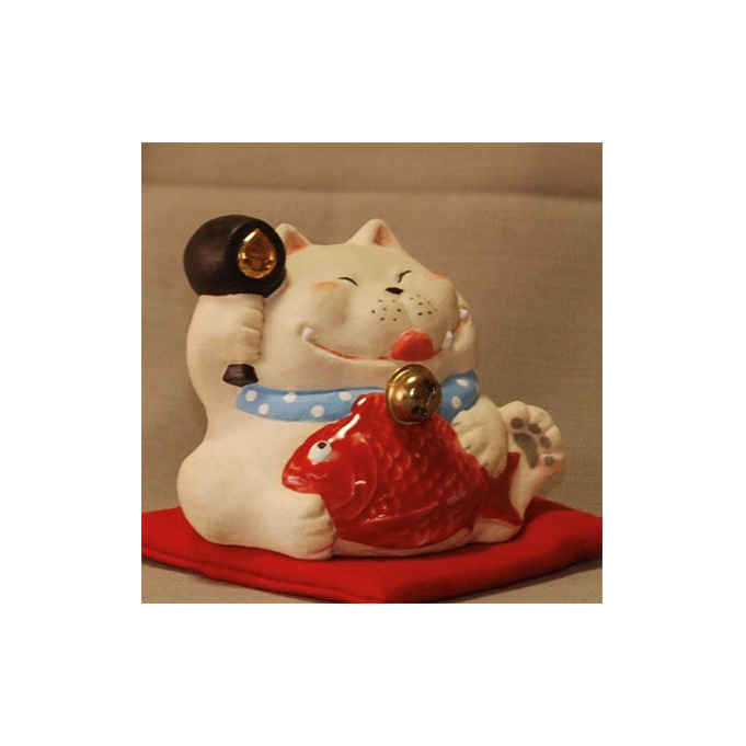 恵比須様と大黒様の両方を兼ね備えた欲張りな猫。彩色は手描き、小槌には本金を使用しています。