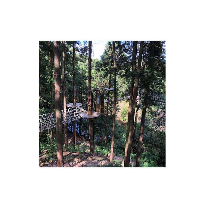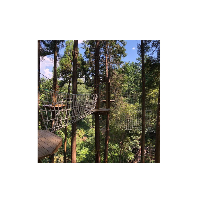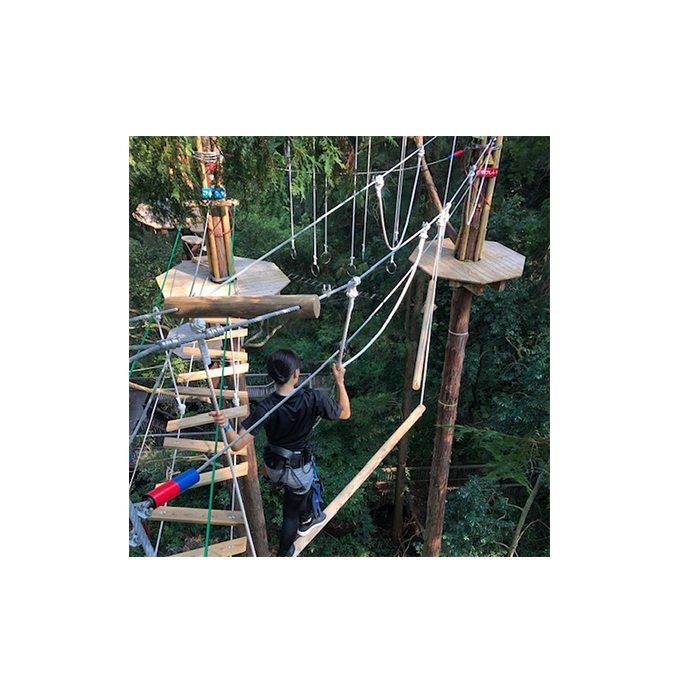 身長110cm~かつ小学生~ご体験可能、全3コースの空中アスレチックです!大人は童心に帰り、子どもは自分の限界に挑戦!最大高さ10m、揺れる丸太やネットつたう遊具など多彩な遊具展開です。ジップラインも計3本、3本目には150mの池越えジップラインがあり、爽快感・達成感抜群です!森の中から元気にお待ちしています~!