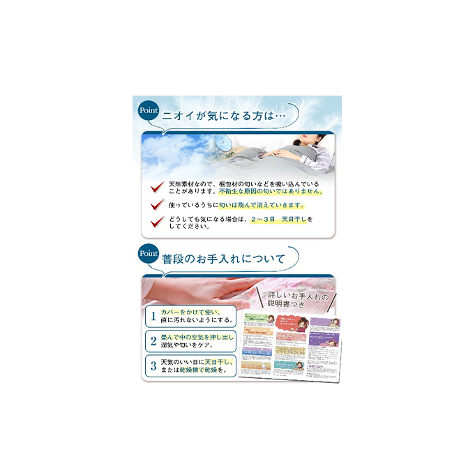 こちらの製品は、ダウンパワー330dpランクの羽毛を使用しております。厳格な管理が行われた安心の羽毛を使用しておりますので、快適に、安心してご使用いただける羽毛ふとんでございます。