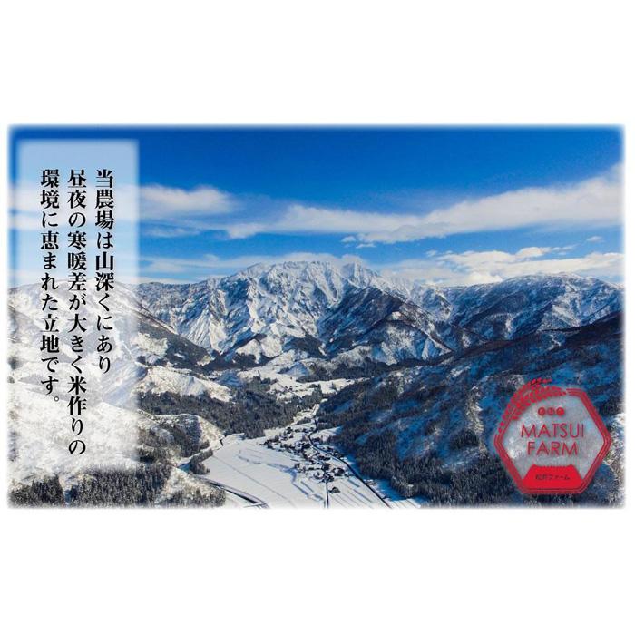 名峰・越後山脈に連なる桂山の麓で有機栽培・特別栽培米等の米作りに取り組む松井ファームの育てたお米。当農場は、南魚沼市の山深い五十沢地区に位置し、三国川のきれいな水、昼夜の寒暖差が大きく米作りの環境に恵まれた立地にあります。また、山々からの豊富な雪解け水は、お米の生育に重要なミネラルや栄養を与えてくれています。