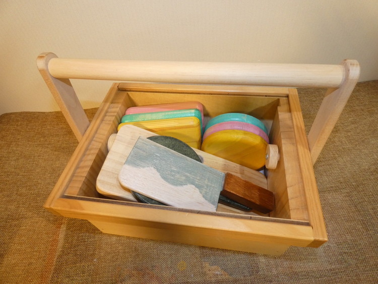 切ったものを面取りしやすりをかけ、色付けやニス塗りをして完成。