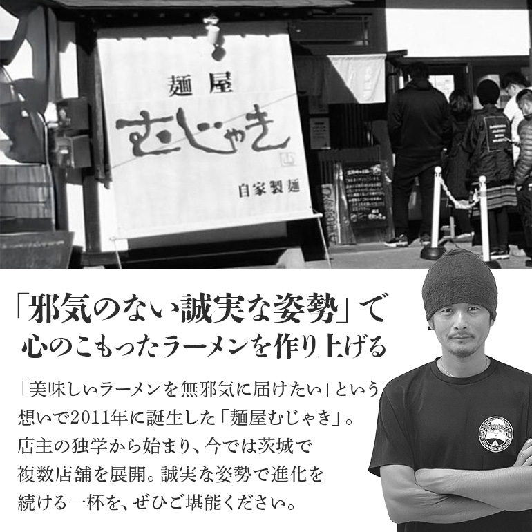 無邪気に心のこもった美味しいラーメンを作りたいという想いで、2011年3月5日にオープンした「麺屋むじゃき」。ラーメンの食べ歩きが趣味の店主が自分の舌を頼りに独学で作り上げ、今では茨城で複数店舗を展開する人気店にまで成長した。現在も老若男女関わらず、多くのお客様にラーメンを食べて頂ける喜びを日々感じている。「邪気のない誠実な姿勢」を胸に進化していく「麺屋むじゃき」一杯を堪能してほしい。