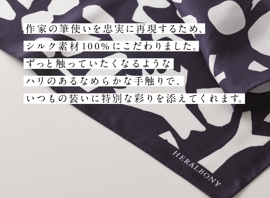 異彩を放つ作家の筆使いを忠実に再現するため、シルク素材100%にこだわりました。ずっと触っていたくなるようなハリのあるなめらかな手触りで、いつもの装いに特別な彩りを添えてくれます。