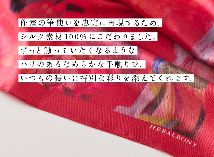 異彩を放つ作家の筆使いを忠実に再現するため、シルク素材100%にこだわりました。ずっと触っていたくなるようなハリのあるなめらかな手触りで、いつもの装いに特別な彩りを添えてくれます。