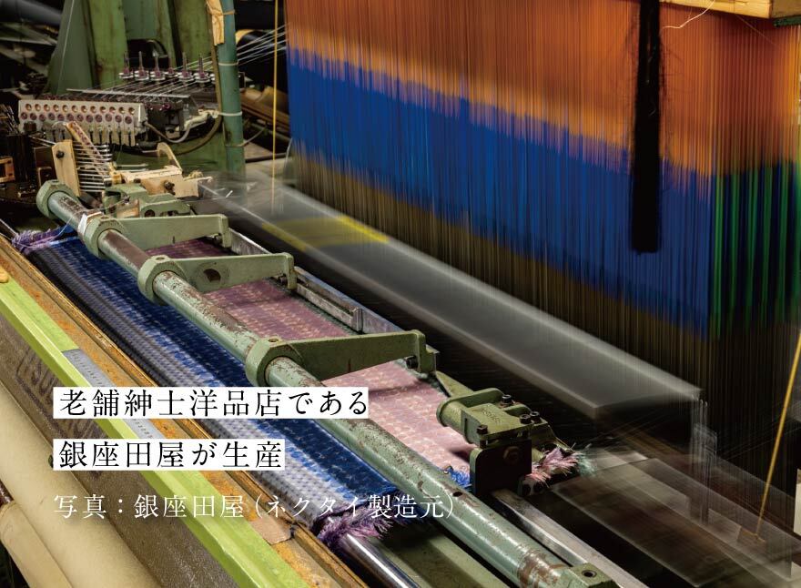 一般的なネクタイは、一線上に3本の糸が並ぶ「1列3層」の生地が使われ、絵柄の見えない生地の裏(中)には、糸が通っていません。銀座田屋の生地は、「1列6層」。色数も通常の倍以上使い、裏(中)にもしっかりと糸を通してムラのない均一な厚みを保っています。また、通常の半分の太さの極細糸を使用するため、生地の密度が高く、風合いはしなやか。これにより、ノットが崩れず美しいまま保たれ、締め心地の良さを実現しています。