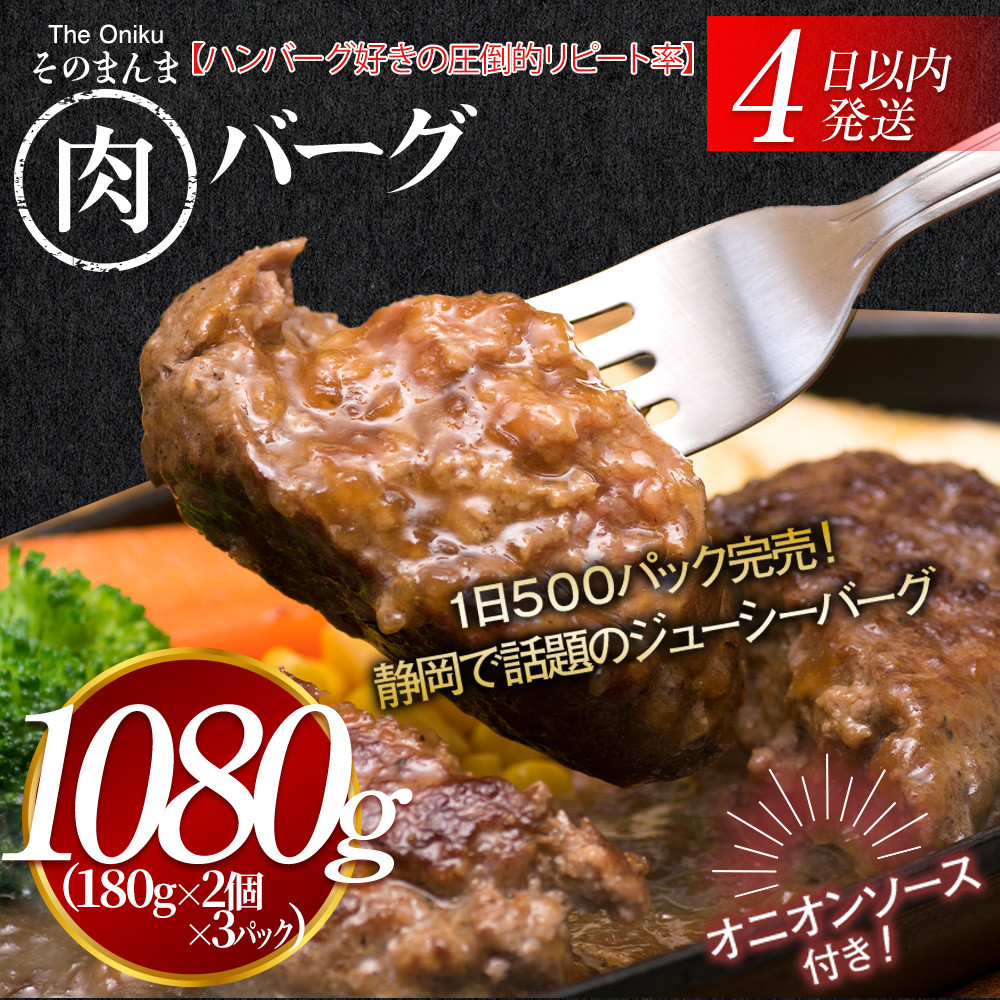 | 原材料名 | ・そのまんま肉バーグ:牛肉(オーストラリア産)、食塩、グラニュー糖、香辛料/調味料(アミノ酸等)、(一部に牛肉・豚肉を含む) ・オニオンソース:玉ねぎ(中国)、しょうゆ(小麦・大豆を含む)、りんご果汁、醸造酢(りんごを含む)、りんごパルプ、果糖、桃、かつお節エキス、にんにく/増粘剤(加工でん粉)、調味料(アミノ酸等)、香料 |