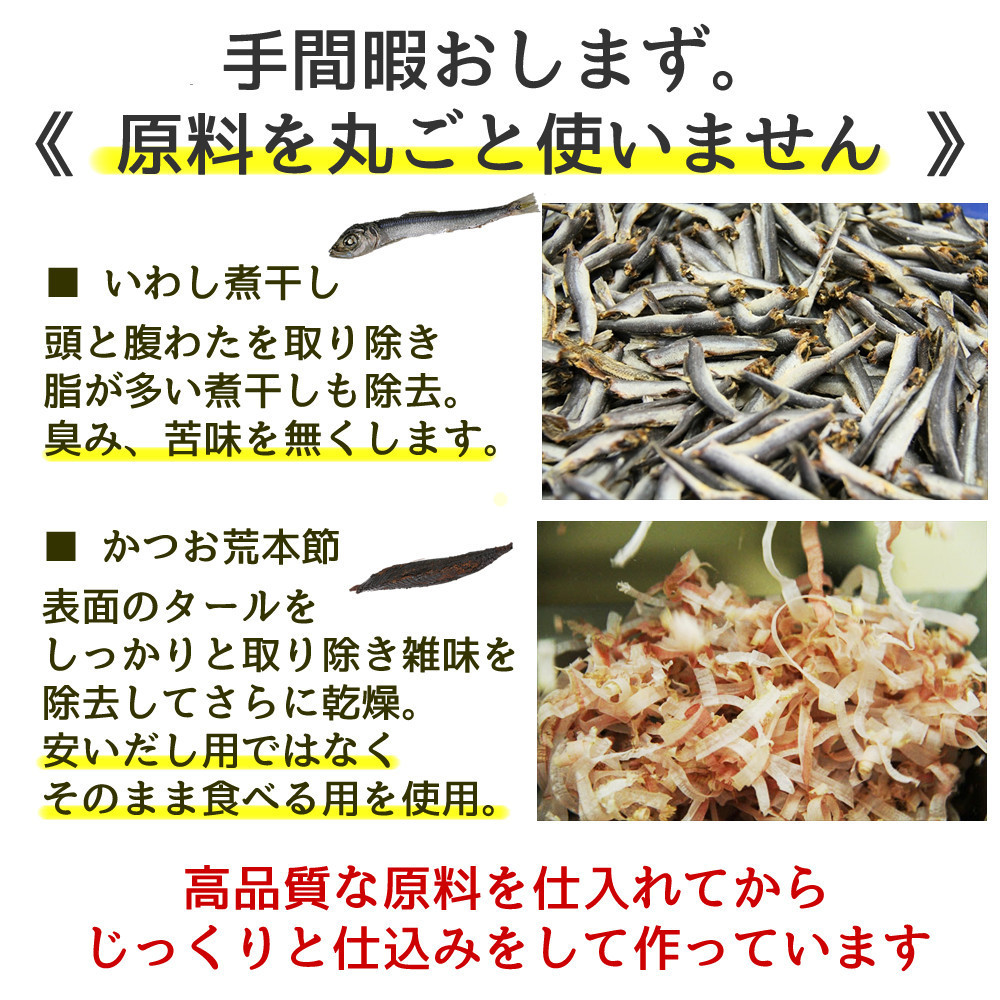 | 原材料名 | 【焼あご入だしパック】原材料:まぐろのかれぶし(まぐろ(鹿児島県産))、かつおのかれぶし(かつお(鹿児島県産))、かつおのふし(国内製造)、焼あご(とびうお(長崎県産))、いわしの煮干し(いわし(国産))、昆布(北海道産) 【かつお昆布だしパック】原材料:かつおのかれぶし(かつお(鹿児島県産))、かつおのふし(国内製造)、昆布(北海道産) |