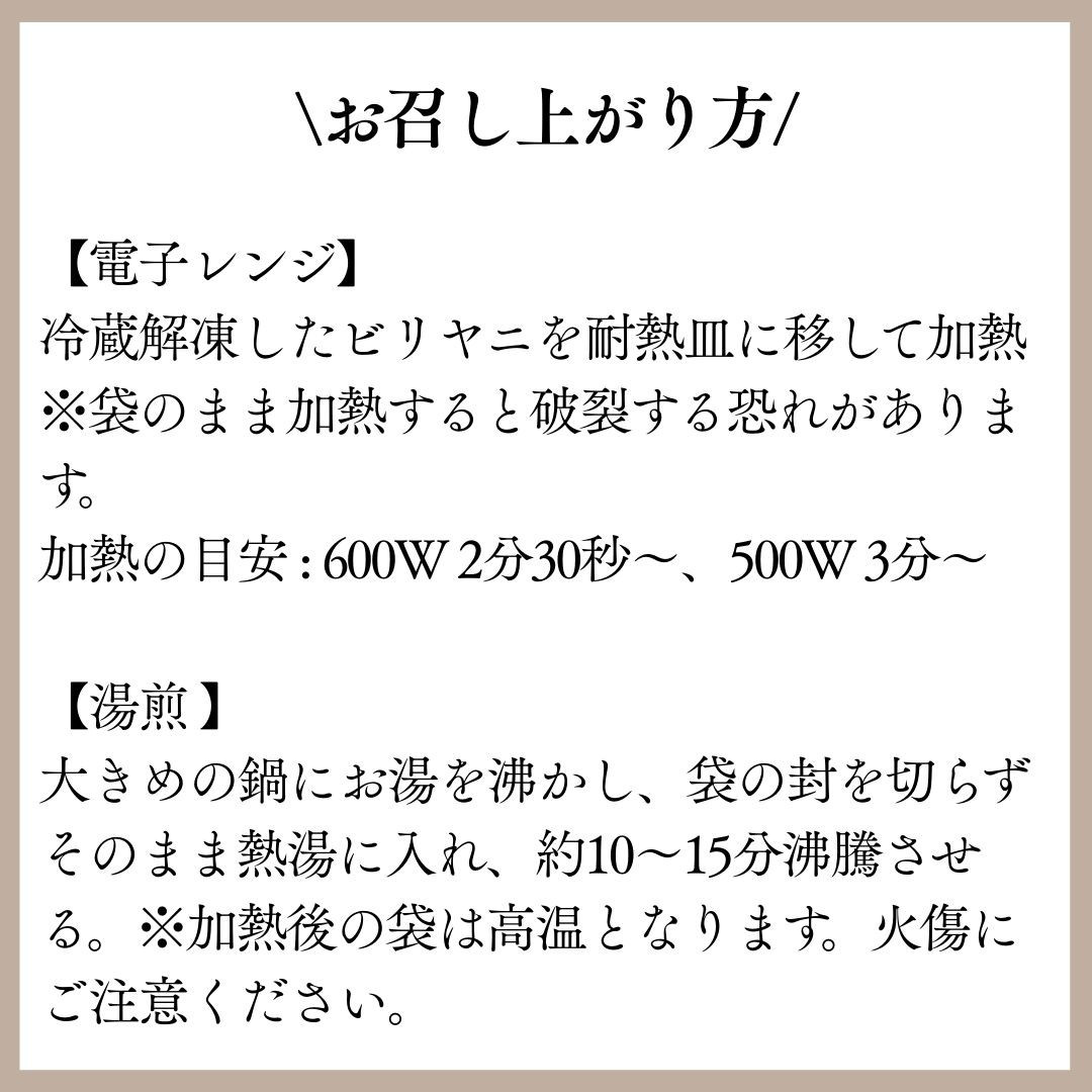 | 原材料名 | チキンカッチビリヤニ:米(パキスタン産)、鶏肉、発酵乳、玉ねぎ、植物油、ギー、天日塩、香辛料、にんにく、しょうが、唐辛子、香菜、ミント、アダン抽出液、(一部に乳成分・鶏肉を含む) チキンダムビリヤニ:米(パキスタン産)、鶏肉、発酵乳、玉ねぎ、植物油、ギー、にんにく、しょうが、天日塩、唐辛子、香辛料、香菜、ミント、レモン果汁、アダン抽出液、(一部に乳成分・鶏肉を含む) チキンボイルドビリヤニ:米(インド産)、鶏肉、玉ねぎ、有機トマト・ジュースづけ(有機トマト、有機トマトジュース)、発酵乳、植物油、ギー、香菜、天日塩、香辛料、にんにく、しょうが、唐辛子、ココナッツファイン、ミント、アダン抽出液、(一部に乳成分・鶏肉を含む) |