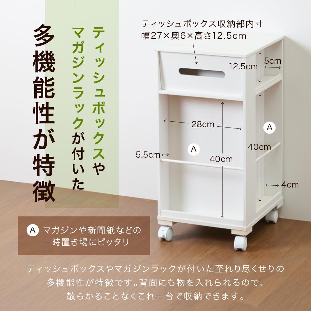 ティッシュボックスやマガジンラックが付いた至れり尽くせりのオシャレなワゴン。