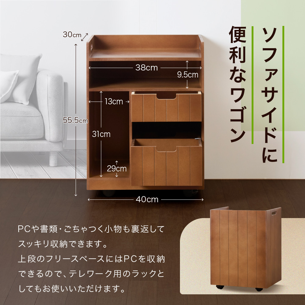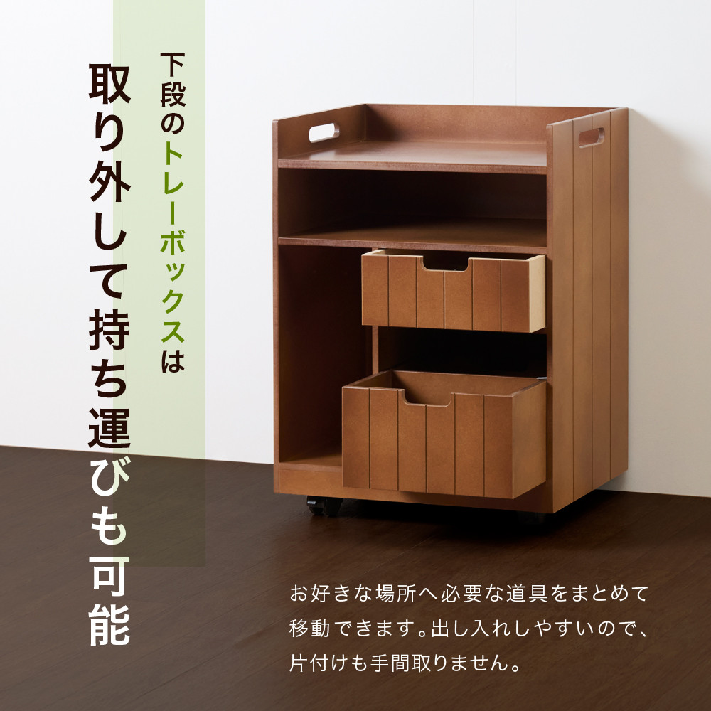 ソファサイドに便利なワゴン。PCや書類・ごちゃつく小物も裏返してスッキリ収納できます。上段のフリースペースにはPCを収納でき、下段のトレーボックスは取り外して持ち運びも可能。