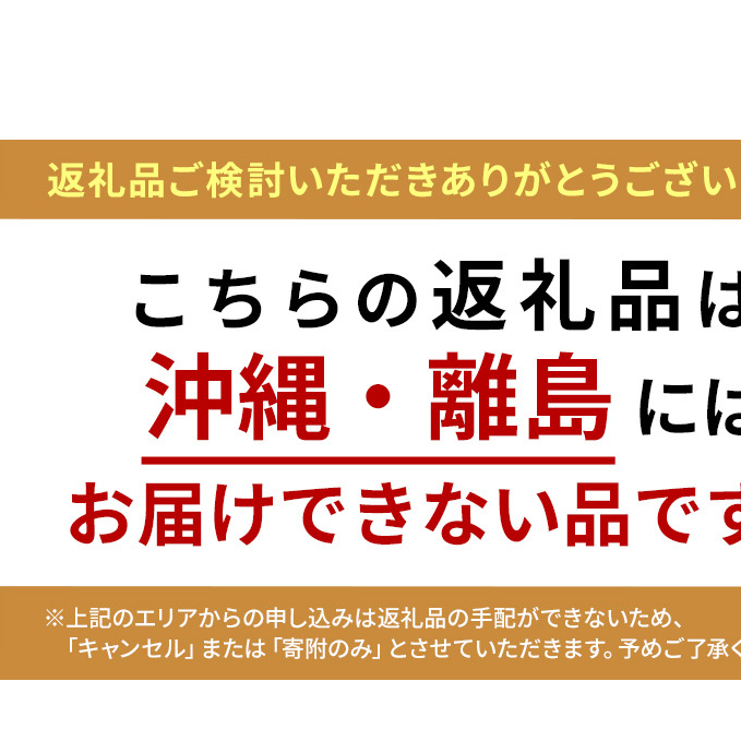 ※上記のエリアからの申し込みは返礼品の手配が出来ないため、「キャンセル」または「寄附のみ」とさせていただきます。予めご了承ください。