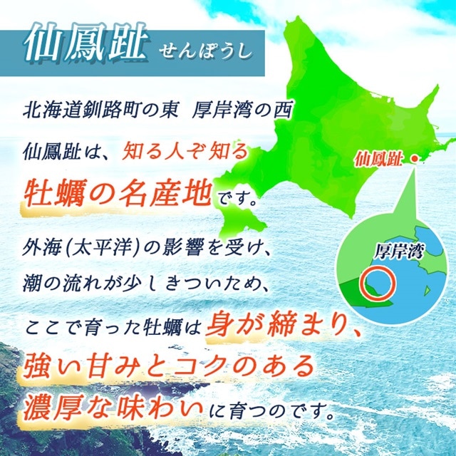 仙鳳趾は、北海道釧路町の東、厚岸湾の西にあるカキの名産地。水揚げされたばかりの牡蠣をお届けします。