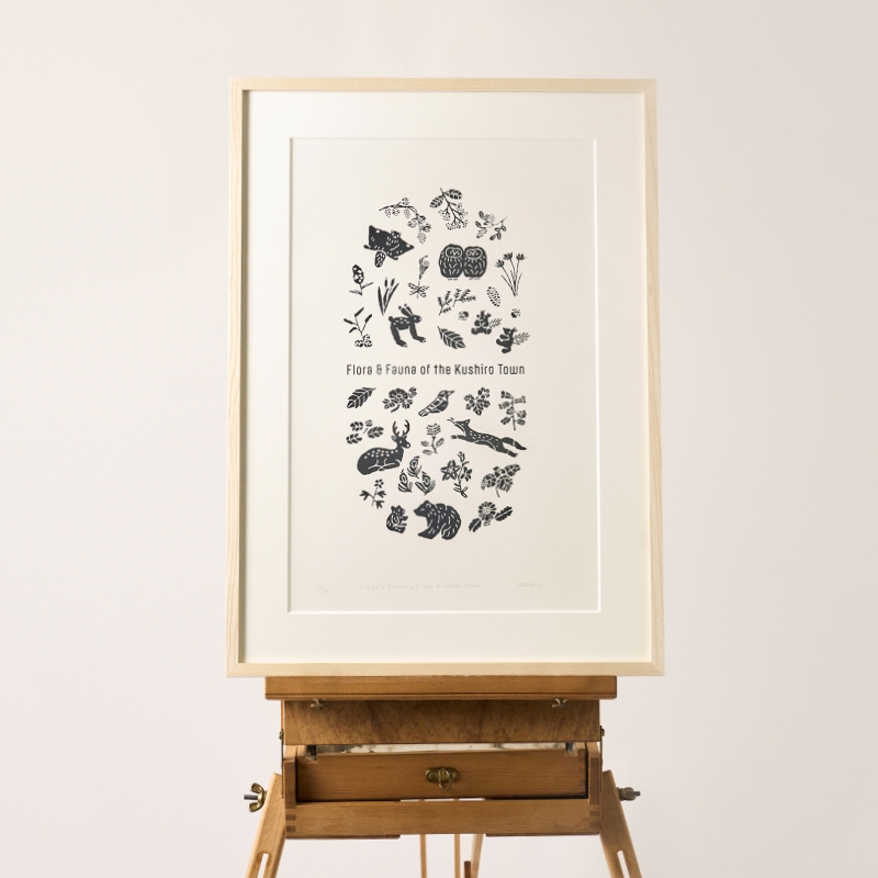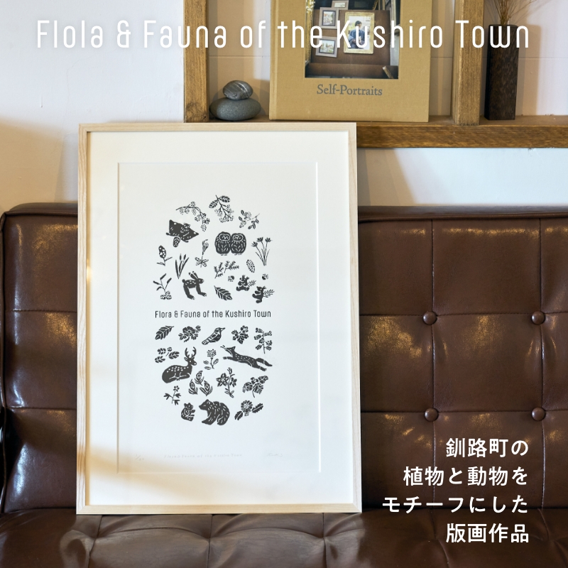 釧路町在住の作家、磯優子による「釧路町の動植物」をモチーフにしたシルクスクリーン印刷作品の額装作品です。