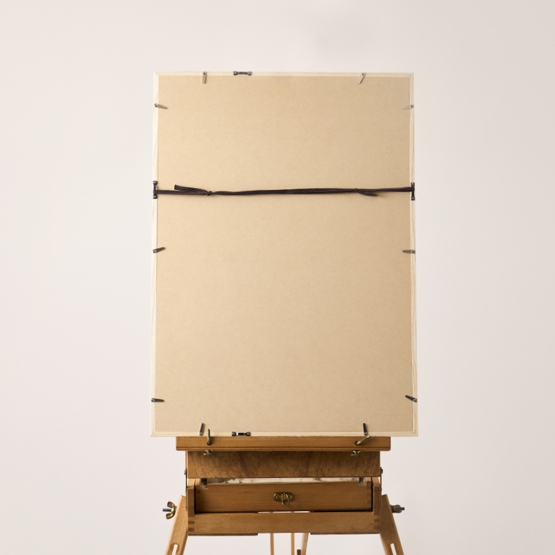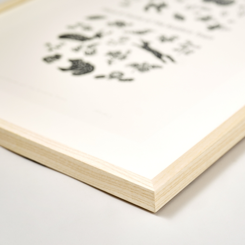 A2サイズの無垢材の額にブラックインクで刷り上げたイラストレーションはどんな場所にも飾ることができるスタンダードな作品となっています。