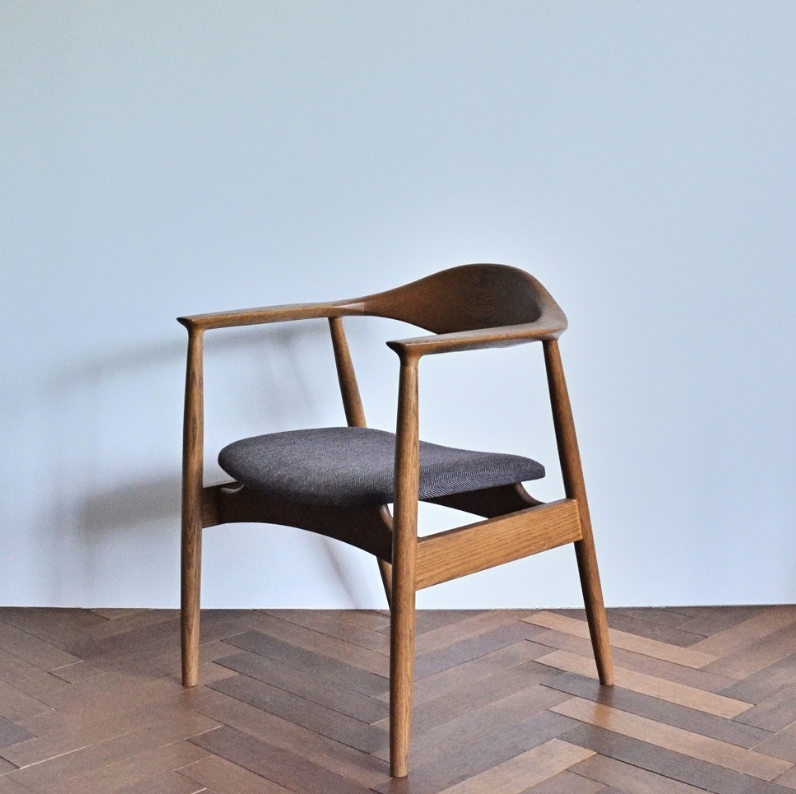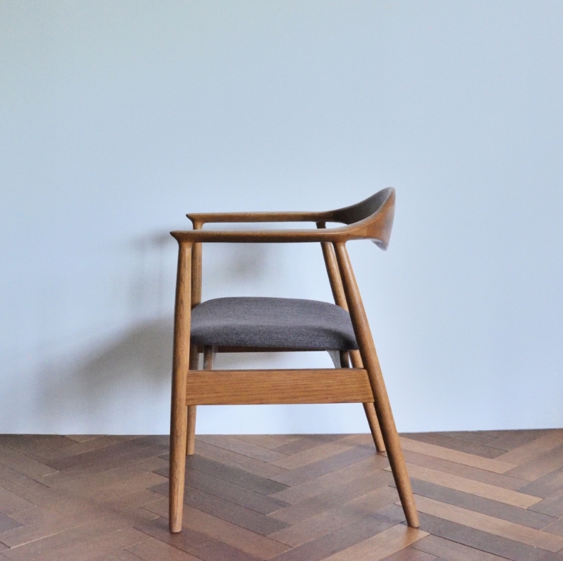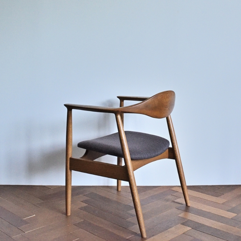 手をのせる部分は特にこだわり、滑らかに仕上げています。背もたれの曲線が背中にフィットしてとても良い感じです。後ろ脚も勾配がついており、スマートなデザインになっています。