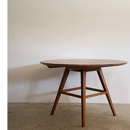オークの無垢材で製作した丸テーブルです。大きな丸テーブルは人数の融通が利いて便利です。特徴的な脚は先細り(テーパー加工)にしている脚をさらに八の字方向に傾けること(四方転び)によって、重心を低く保ちつつ接地面が広がり、横方向への力に強くなります。転倒しにくくガタつきにくくなります。デザイン的にも綺麗なシルエットになります。脚と幕板(天板の裏にある、たわみを防ぐための板)の接合部分は金物を使わず、ほぞ加工で組まれています。天然塗料を使用しているので、ナチュラルテイストな仕上がりになっています。