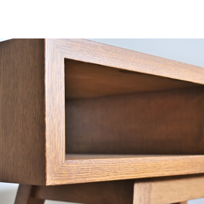 オーク材で製作した小さな木製ローテーブルです。オープン棚が付いているので、tvボードやオーディオラック・ナイトテーブル・ソファの横のサイドテーブルとしても使えます。脚を四方転び(八の字方向に傾けること)にしています。四方転びによって、重心を低く保ちつつ接地面が広がり、横方向への力に強くなります。転倒しにくくガタつきにくくなります。デザイン的にも綺麗なシルエットになります。コンパクトな家具なので、持ち運びに便利です。天然塗料を使用しているので、ナチュラルテイストな仕上がりになっています。